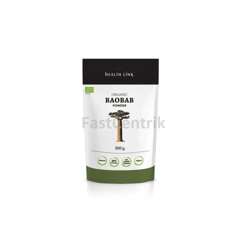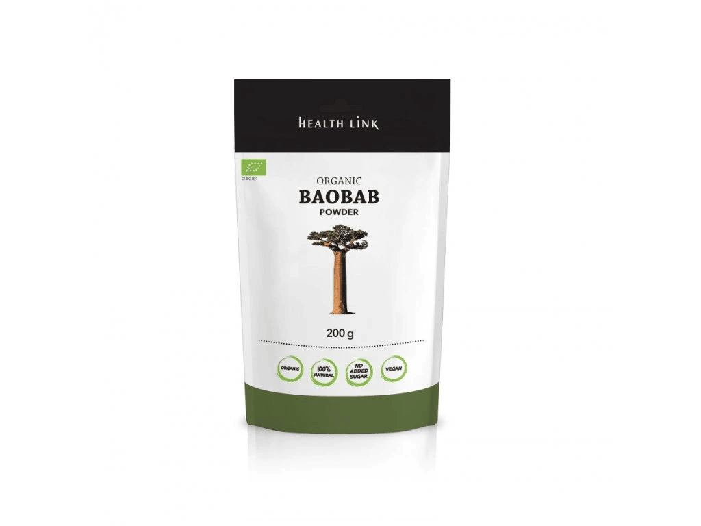 HEALTH LINK BIO Baobab prášek je 100% přírodní prášek z dužiny plodů baobabu (Adansonia digitata) v BIO kvalitě, bohatý na vitamíny, minerály a vlákninu. Ideální do smoothie, jogurtu či vody jako přírodní zdroj energie a osvěžení.