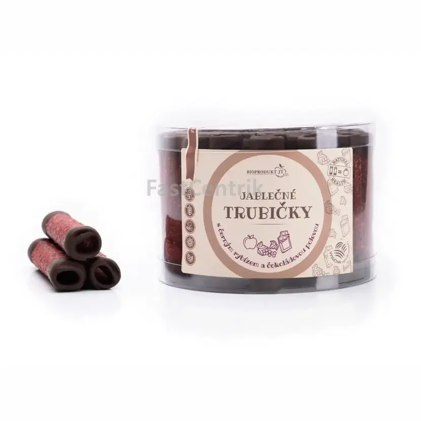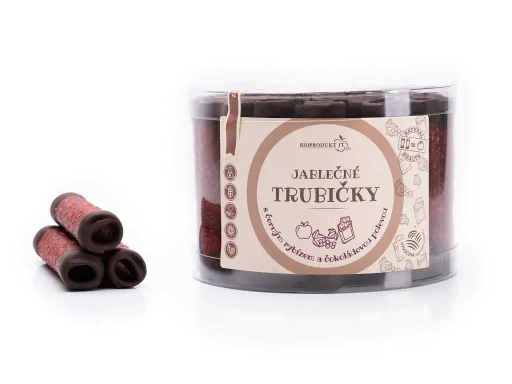 Základem těchto trubiček je vyvážená směs jablek a černého rybízu, zpracovaná na speciálním homogenizéru vlastní výroby. Tento proces narušuje buněčné obaly ovocné vlákniny, čímž do dřeně uvolňuje cenné látky, které by jinak zůstaly nevyužity. Šetrné sušení při nízkých teplotách do 42 °C zajišťuje, že si výsledná pochoutka v RAW kvalitě zachová vysoký podíl antioxidantů, vitamínu C a vydatné množství vlákniny. Kvalitní čokoládová poleva od českého výrobce a sypání strouhaným kokosem pak dodávají trubičkám výzor luxusního a zdravého dezertu.