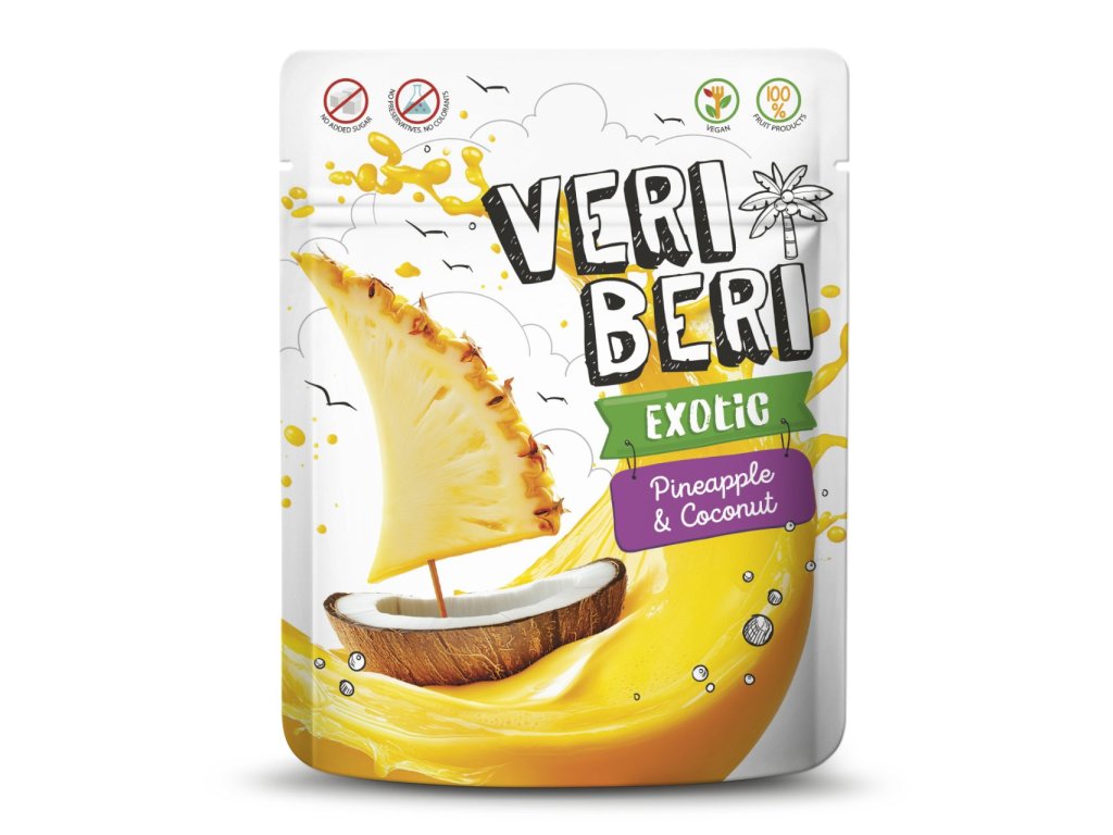 Veri Beri Exotic Ananas & Kokos je 100% přírodní ovocná sladkost s bohatou chutí šťavnatého ananasu a krémového kokosu, doplněnou o kousky sušeného kokosu pro ještě lepší texturu. Všechny suroviny jsou čistě ovocného původu, bez přidaného cukru, umělých sladidel, barviv či konzervantů a splňují přísné předpisy EU. Produkt je bohatý na vlákninu, neobsahuje alergeny ani lepek a je vhodný pro vegany. Výroba probíhá v certifikovaném závodě podle standardu FSSC 22000 (verze 6), HACCP a Halal.
