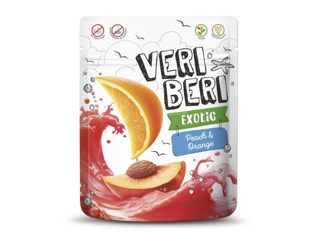 Veri Beri Exotic Broskev & Pomeranč je 100% přírodní ovocná sladkost s výraznou chutí chutí čerstvé broskve a šťavnatého pomeranče, obohacenou o jemné kousky sušeného kokosu pro ještě lepší texturu. Všechny suroviny jsou čistě ovocného původu, bez přidaného cukru, umělých sladidel, barviv či konzervantů a splňují přísné předpisy EU. Produkt je bohatý na vlákninu, neobsahuje alergeny ani lepek a je vhodný pro vegany. Výroba probíhá v certifikovaném závodě podle standardu FSSC 22000 (verze 6), HACCP a Halal.