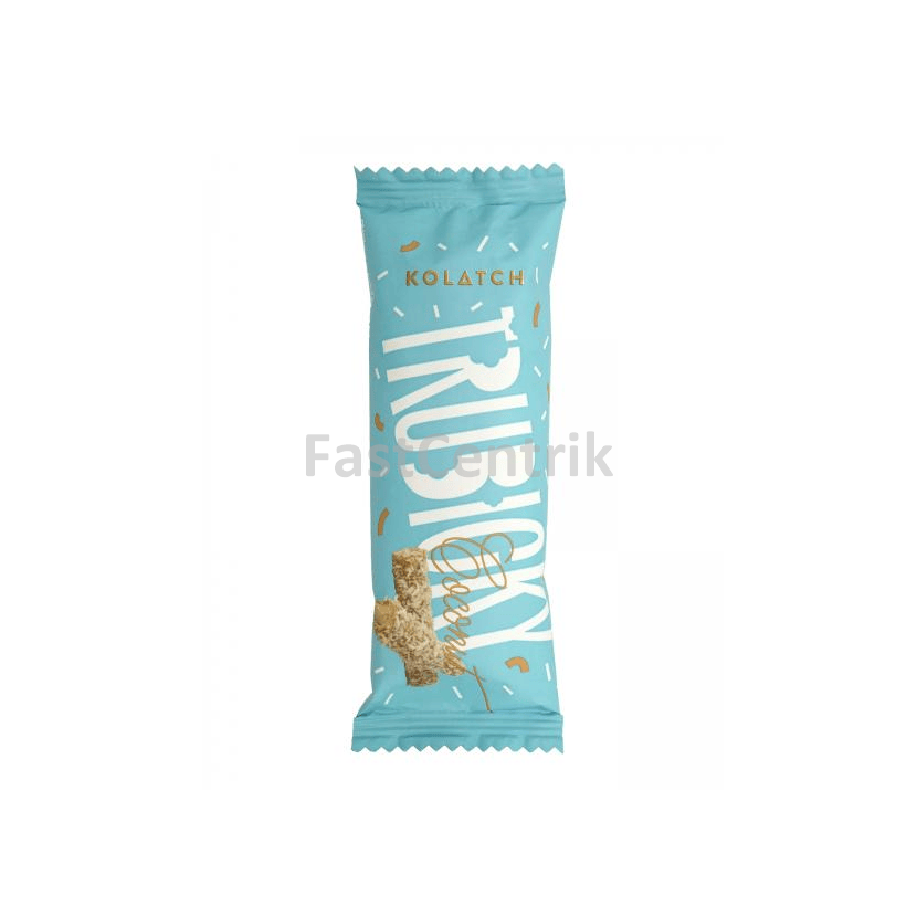 Křehké sušenkové trubičky Kolatch plněné sladkým kokosovým krémem, polité bílou čokoládou s karamelovou příchutí a posypané strouhaným kokosem. Exotická chuť a křupavost v každém soustu.